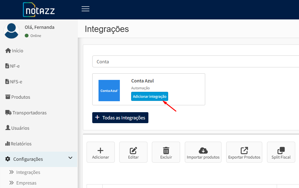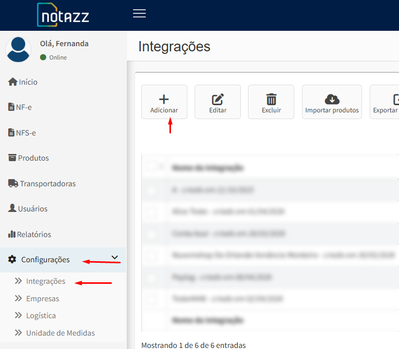 Primeiro, em sua conta Notazz, clique em configurações e depois em Integrações. Agora clique em adicionar