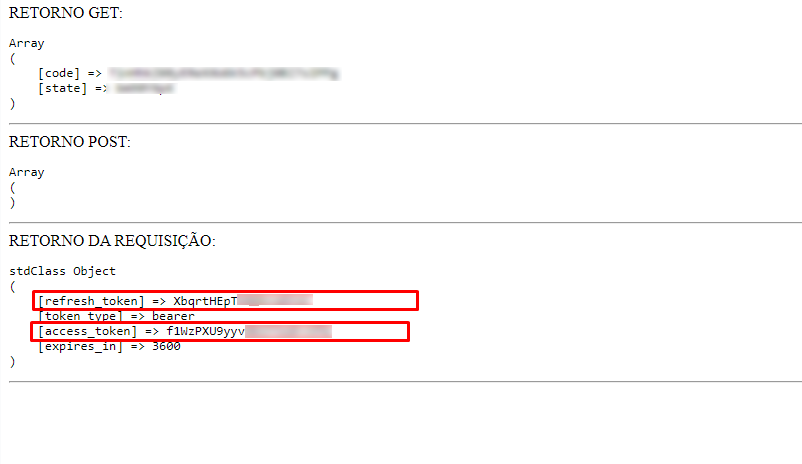 Depois de ter feito a autorização, aparecerá uma página como a mostrada abaixo. Aqui iremos copiar as informações de Refresh token e Access token, vamos precisar delas para preencher a terdceira coluna no Notazz.