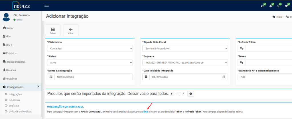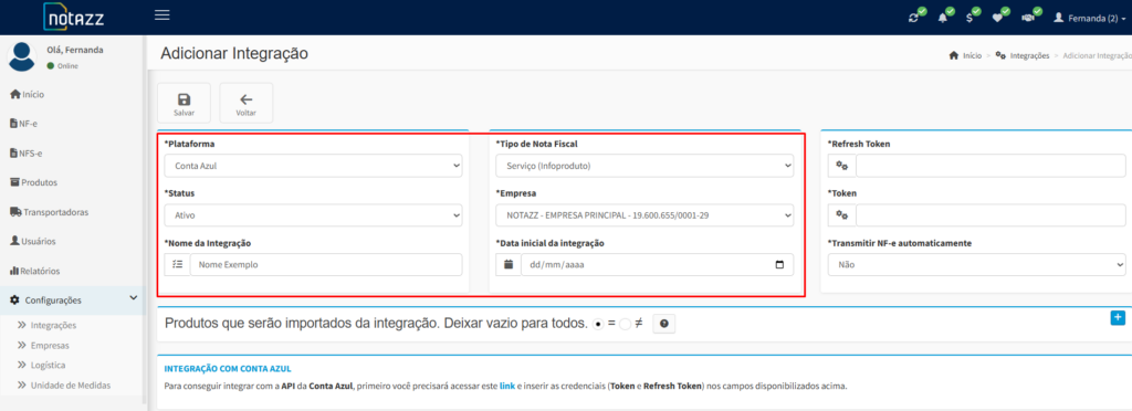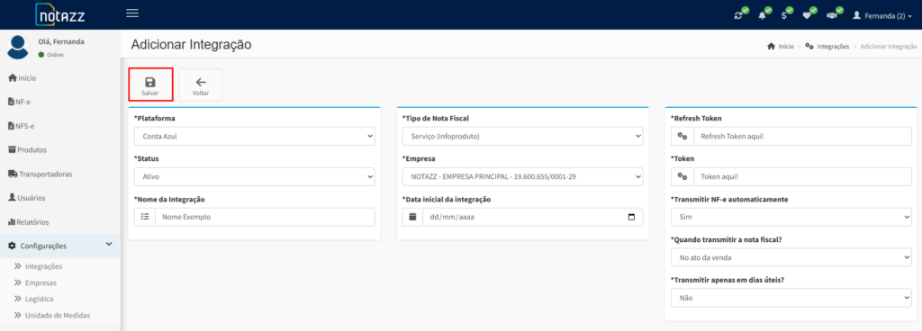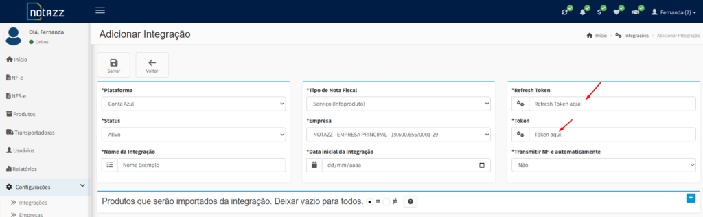 De volta ao seu painel do Notazz, cole as informações copiadas nos respectivos campos.