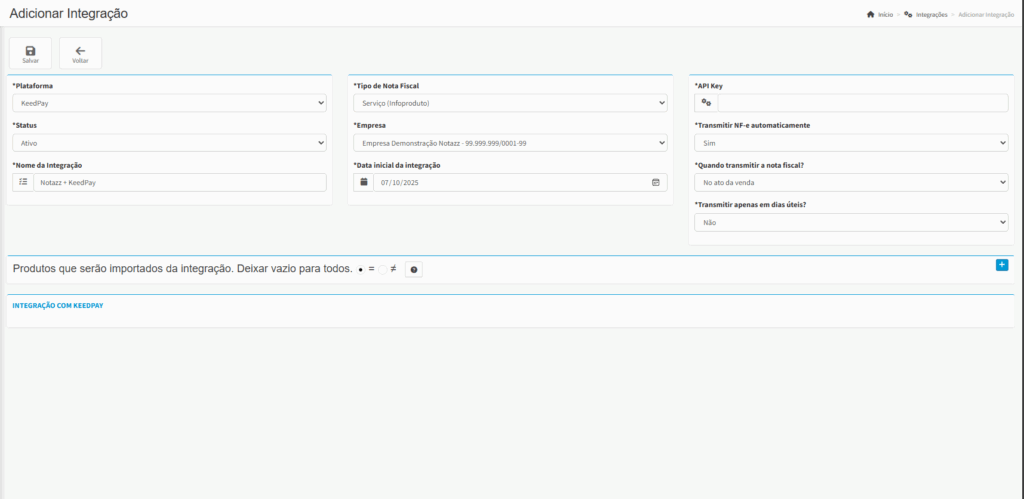 Empresa: Selecione a Empresa que será responsável pelas notas geradas por essa integração.