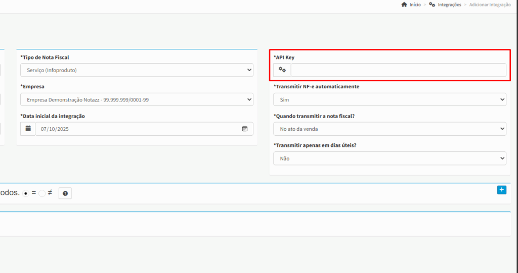 De volta ao Notazz, cole a API Key que você acabou de copiar no campo de mesmo nome.
