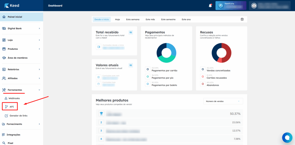 6 – Em sua conta da Keed Pay, procure pelas opções Ferramentas e API no menu lateral.