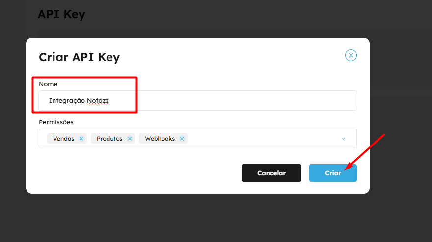 Dê o Nome de Integração Notazz para a nova API key, ative as permissões de vendas, produtos e webhooks e depois clique em Criar.