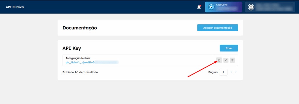 Depois, já com a API Key criada, clique no botão indicado abaixo para copiá-la.